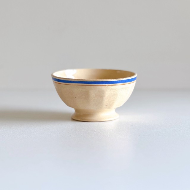 カフェ・オ・レ ボウル 陶器 Moulin des Loups ムーラン・デ・ルー 生産 : 〜1923年 サイズ : 口径 8.9cm / 高さ 4.6cm あたたかみのある象牙色に、ブルーとキャメルのラインがアクセントになっている、フランスらしいボウルです。 側面に一箇所、焼成時に付いたと思われる、釉薬の凹があります。上から釉薬がかかっていますので、目立つことはありません。写真でご確認ください。 ヒビ・カケ・シミなどなく、とても良い状態です。