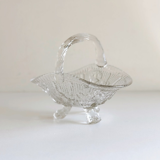 高品質、繊細なガラス加工で知られるロレーヌ地方のガラス工房で作られた小さなパニエです プレスガラス 生産 : 1960年代 サイズ : 幅15.7cm x 奥行12.5cm x 高さ13.5cm リボンのガーランドのモチーフや、猫足など「かわいい」が満載です。 ところどころに気泡が入っています。 ヒビ・カケなどダメージなく、非常に良い状態です。 そのまま飾っていただいても、お花を飾ったり、小さな果実やジャムなどを入れて食卓に並べたり、いろいろ楽しんでいただけると思います。