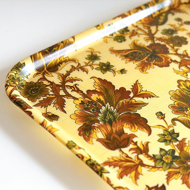 トレイ 素材 : グラスファイバー FRP グラスファイバーとは、ガラス繊維を主成分としたプラスチック(FRP)のことで、1950年代〜70年に製造された、軽くて丈夫な特性を活かしたインテリア雑貨や家具などで、軽くて丈夫、耐腐食性、耐熱性に優れた素材となります。 FRPの利点である軽さと強度を活かし、家具(イス、トレイなど)やプランター(植木鉢)に利用されていました。現代では見られない素材や製造方法で作られているため、現代のプラスチックとは異なり、光に透ける半透明性があり、ヴィンテージ品としてコレクターに大変人気があります。 分かりやすく言うと、イームズのシェルチェアと同じ素材です。 生産 : 1950〜1960年代 サイズ : 45.8cm x 35.7cm x 2cm 光を通す性質があるので、下の色によって、色の雰囲気が異なります。 裏面に長年愛用されたことによる(ファイバーグラスならではの)キズが少々あります。 目立つダメージはなく、とても良い状態です。