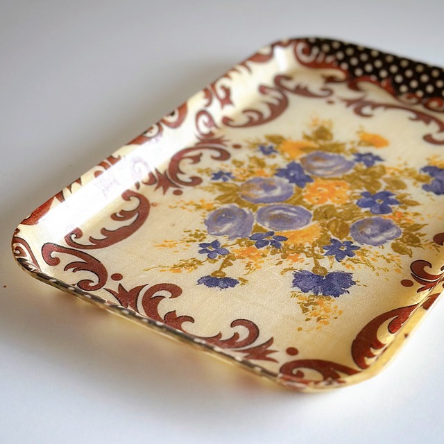 サーヴィングトレ 素材 : グラスファイバー FRP グラスファイバーとは、ガラス繊維を主成分としたプラスチック(FRP)のことで、1950年代〜70年に製造された、軽くて丈夫な特性を活かしたインテリア雑貨や家具などで、軽くて丈夫、耐腐食性、耐熱性に優れた素材となります。 FRPの利点である軽さと強度を活かし、家具(イス、トレイなど)やプランター(植木鉢)に利用されていました。現代では見られない素材や製造方法で作られているため、現代のプラスチックとは異なり、光に透ける半透明性があり、ヴィンテージ品としてコレクターに大変人気があります。 分かりやすく言うと、イームズのシェルチェアと同じ素材です。 生産 : 1950〜1960年代 サイズ : 29cm x 20cm x 2cm 光を通す性質があるので、下の色によって、色の雰囲気が異なります。 裏面に長年愛用されたことによる(ファイバーグラスならではの)キズが少々あります。 目立つダメージはなく、とても良い状態です。