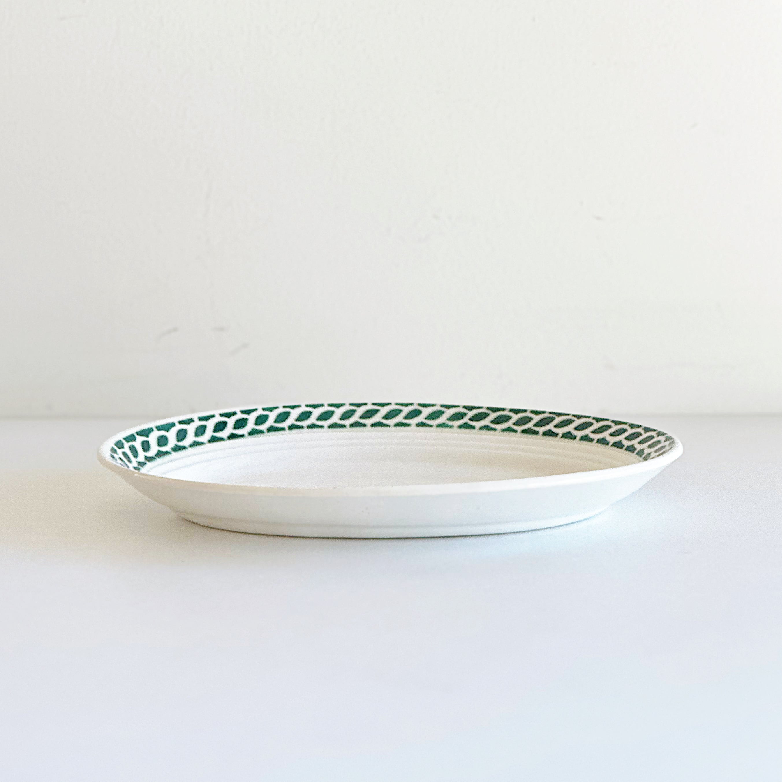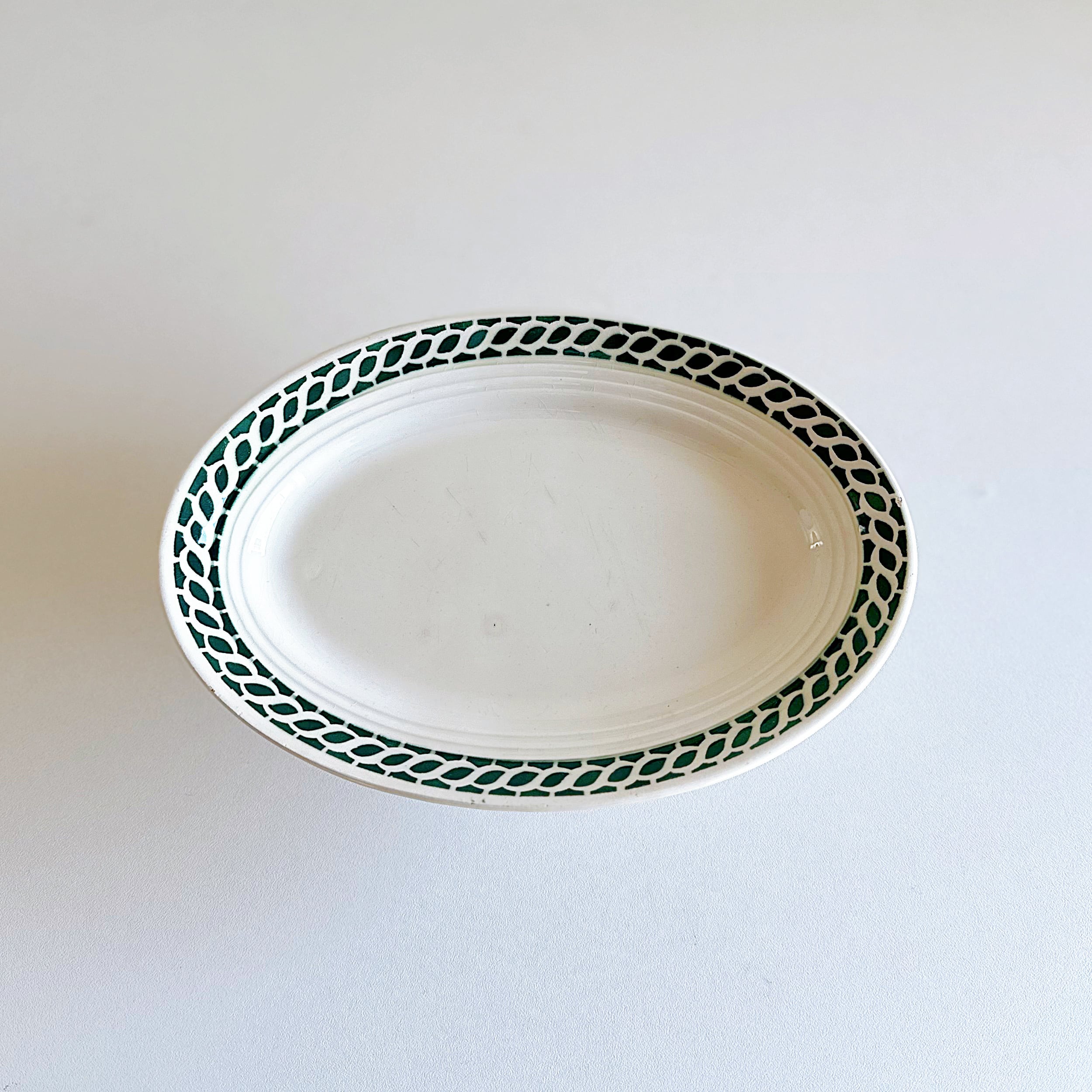 カトラリーなどによるキズ、凹点および、それに伴い薄いシミがあります。縁に1箇所小さなチップがあります。写真でご確認ください。