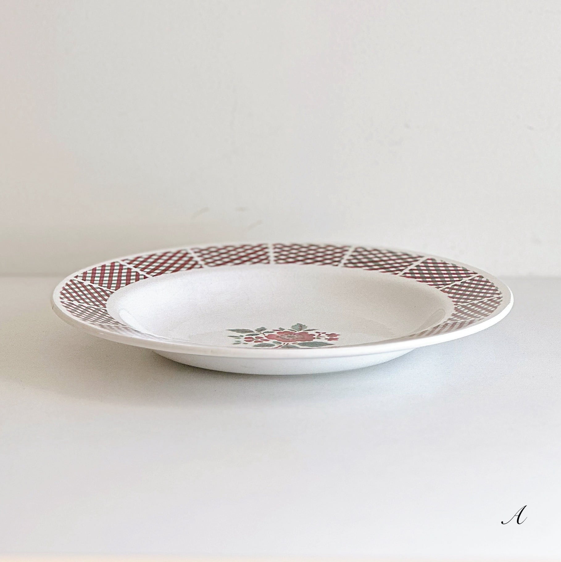 グリーン × ピンクのチェックのリムがノスタルジックで、お料理にほっこりをプラスしてくれる深皿です。