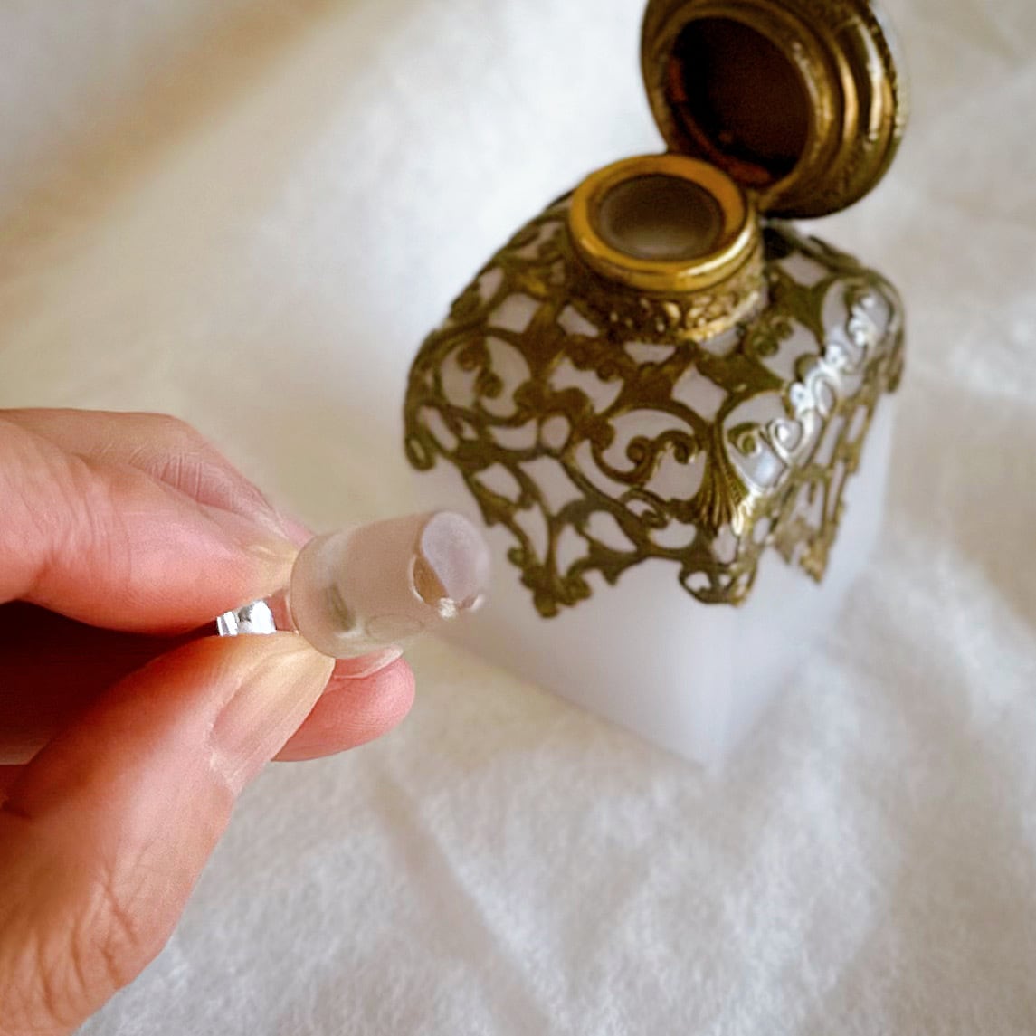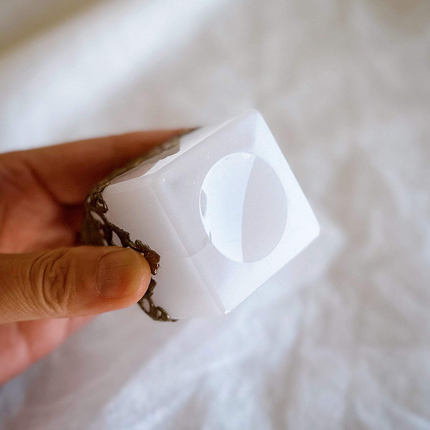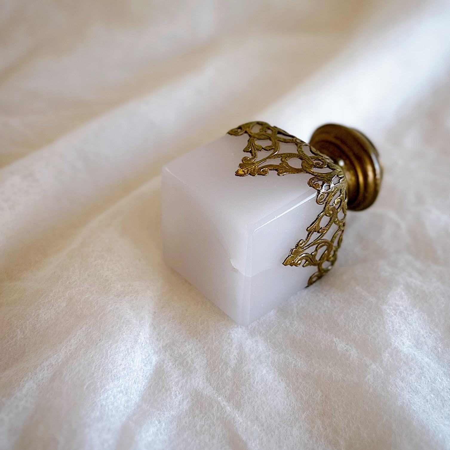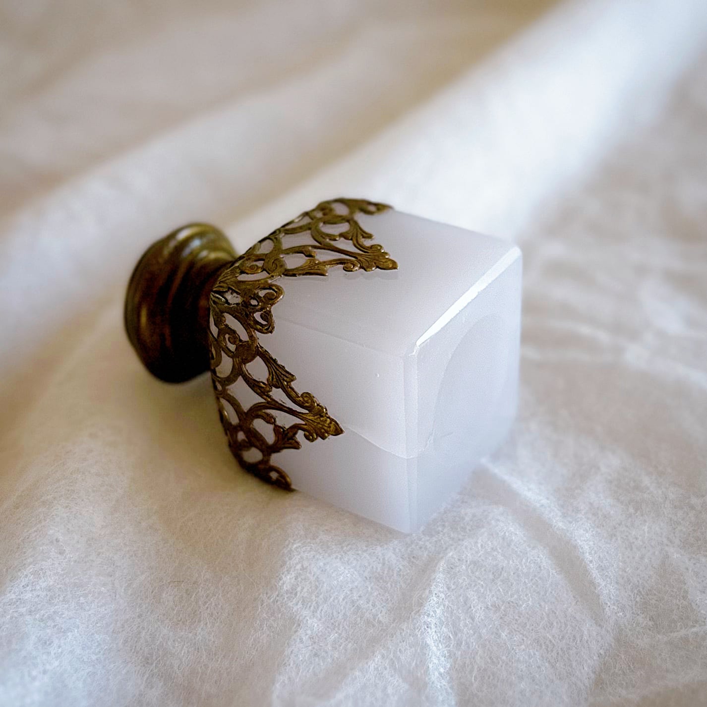 美しく面取りされた立方体は、乳白色のオパリンガラス。