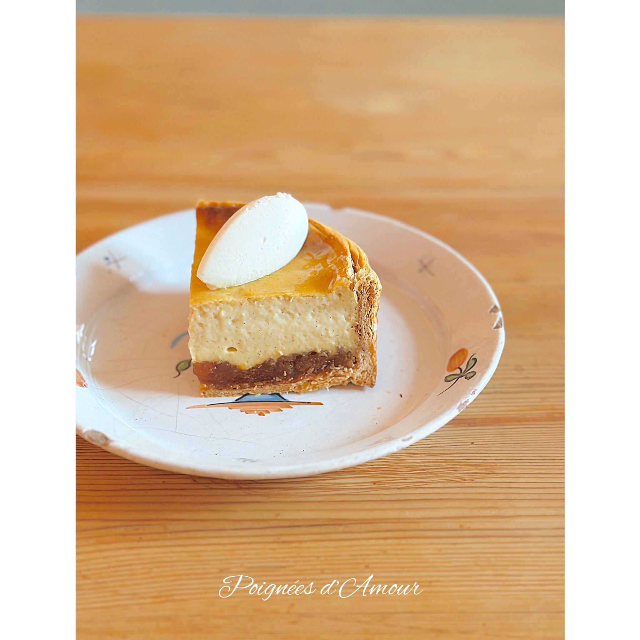 とろみや艶感のある白釉に、落ち着いたアプリコットオレンジの花が描かれた一枚です