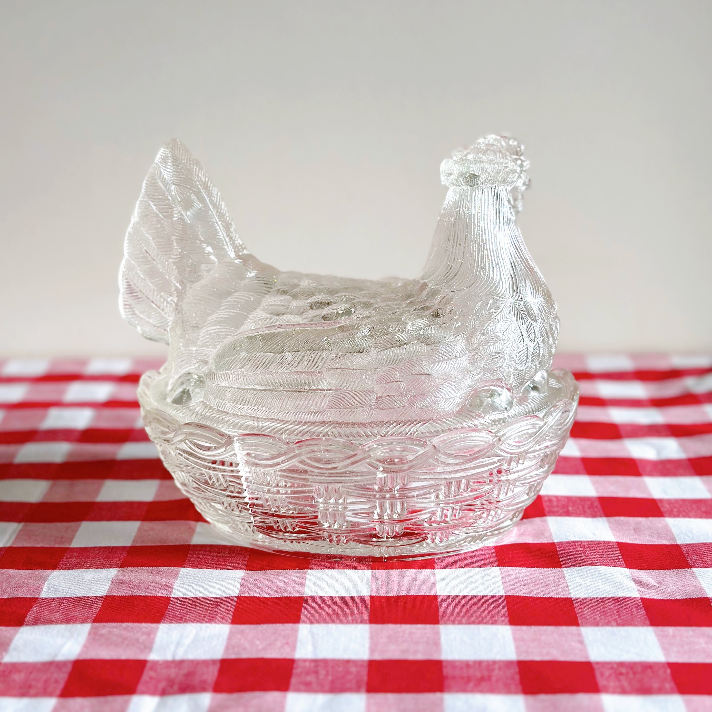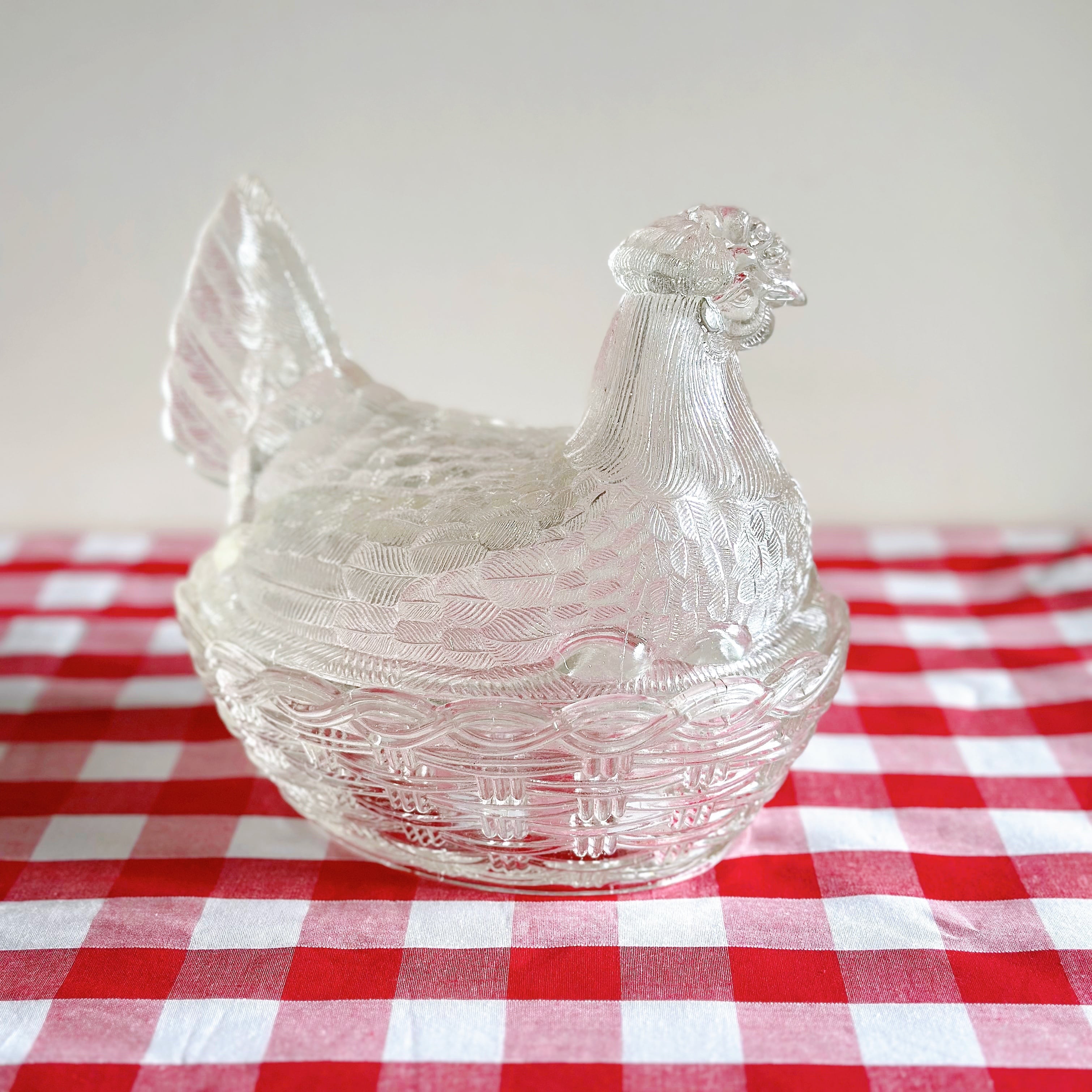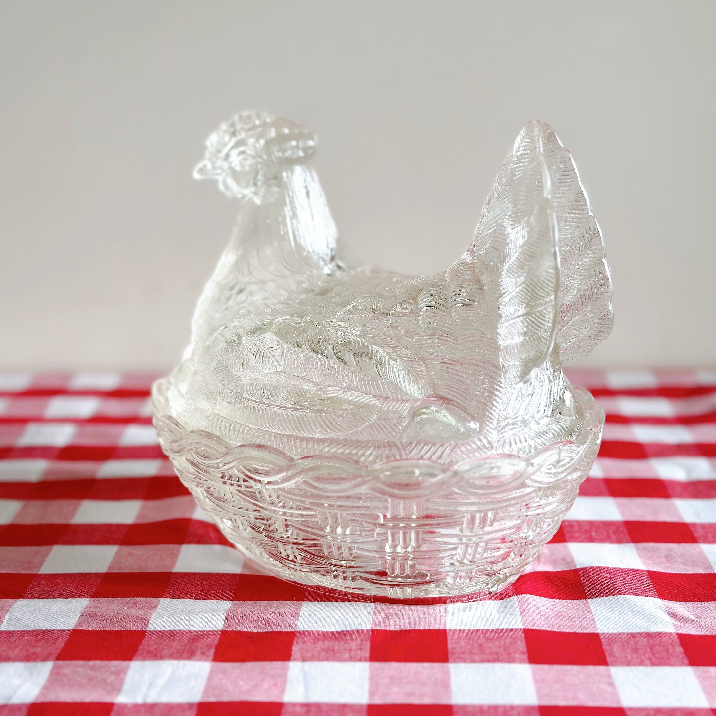 巣の上にいる雌鳥の形のプレスガラスのケースです。