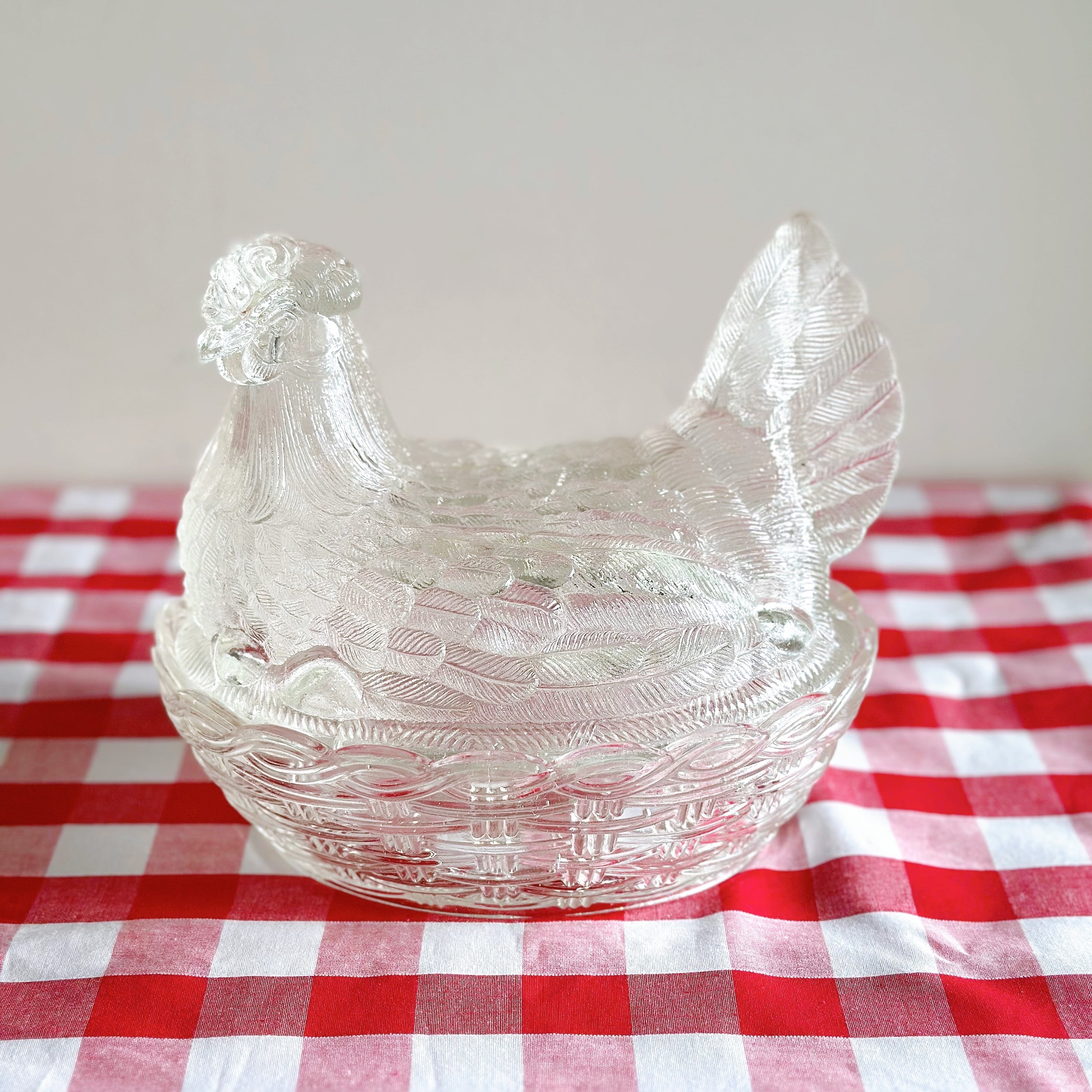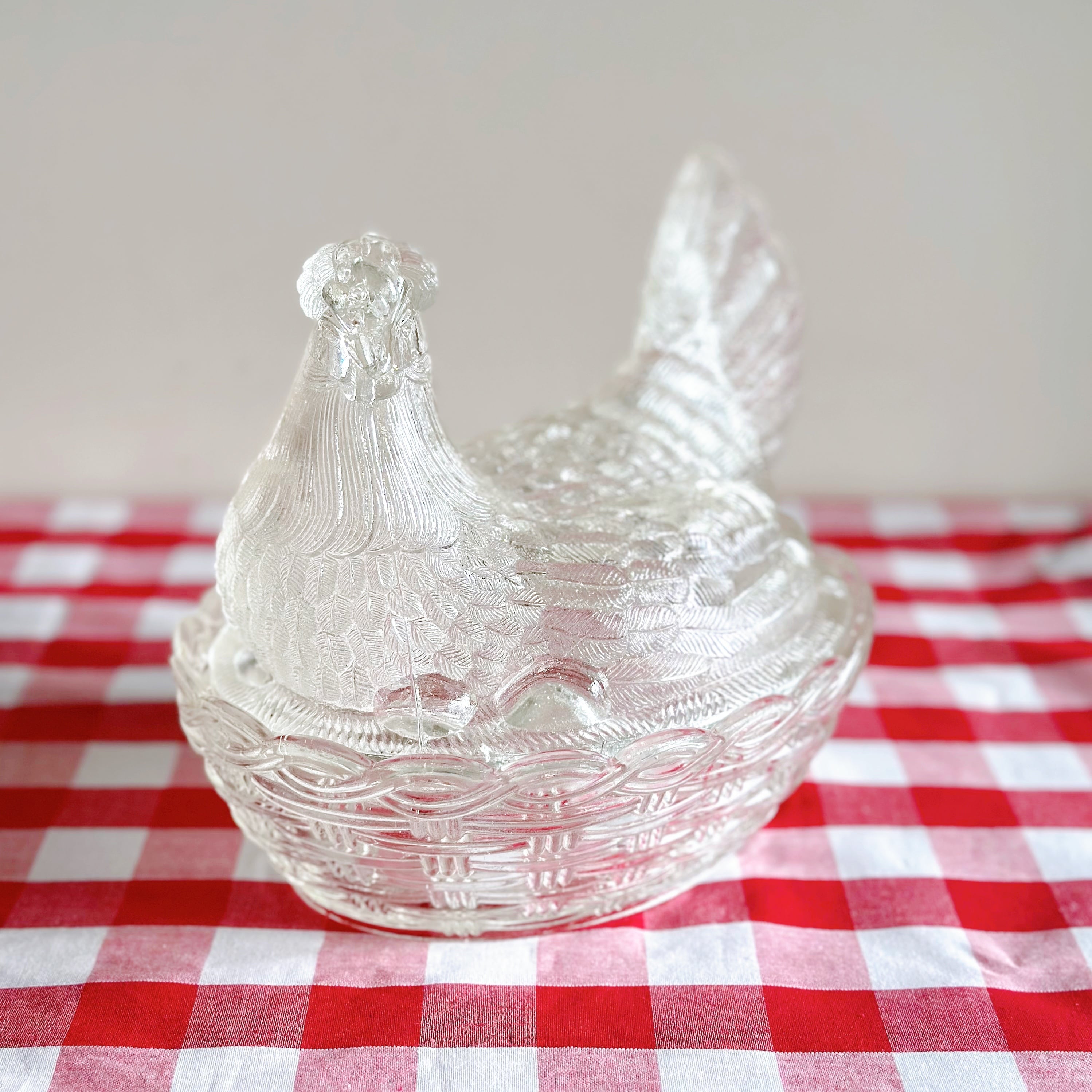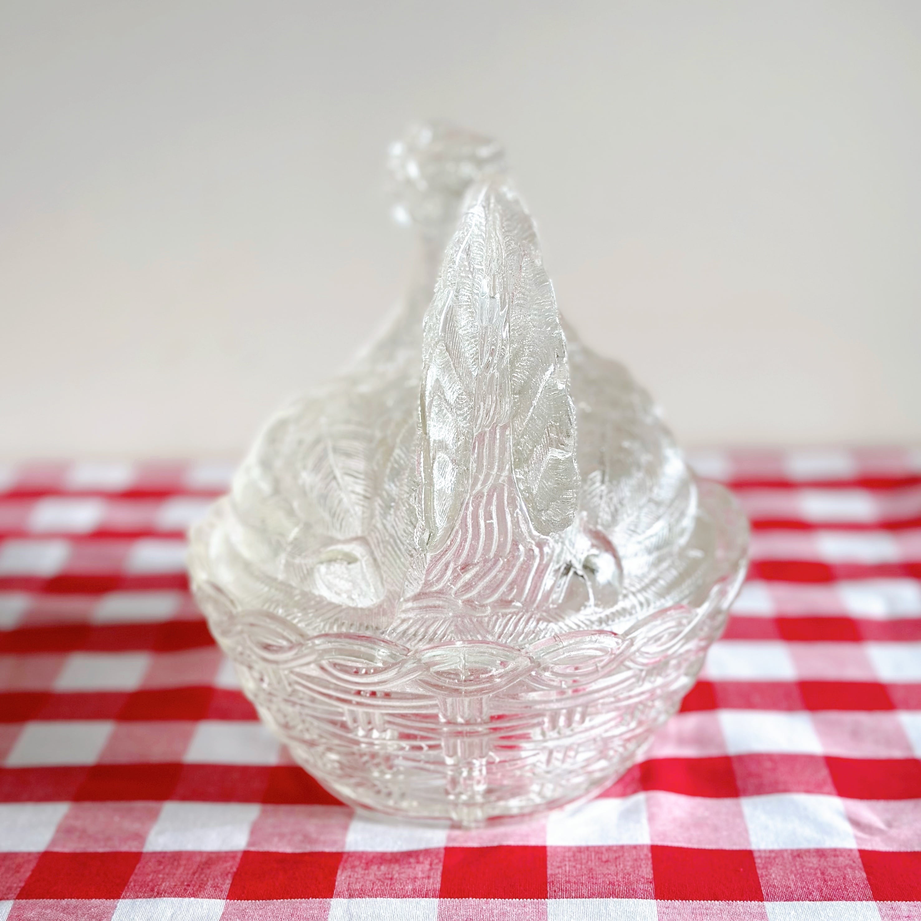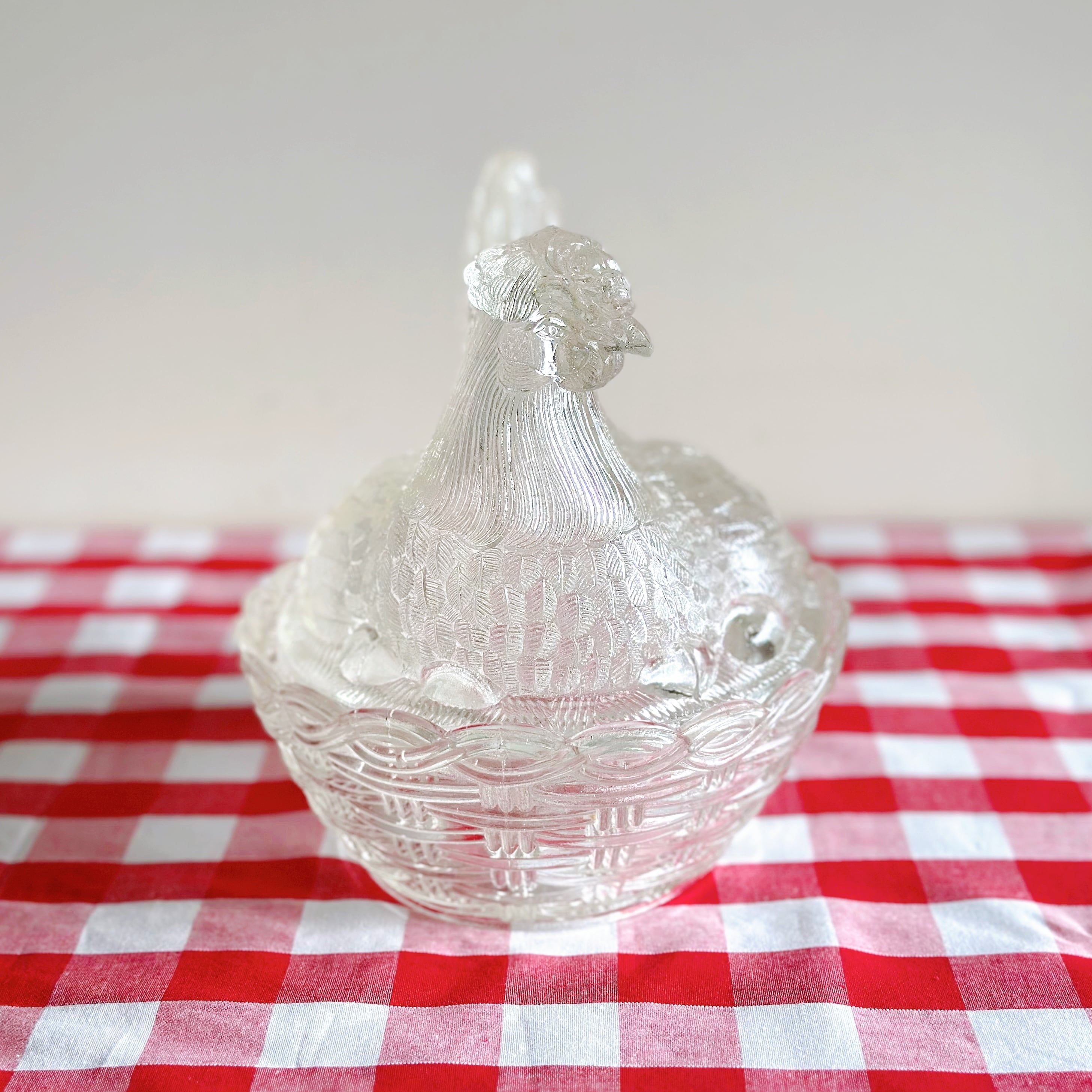 巣の上にいる雌鳥の形のプレスガラスのケースです。