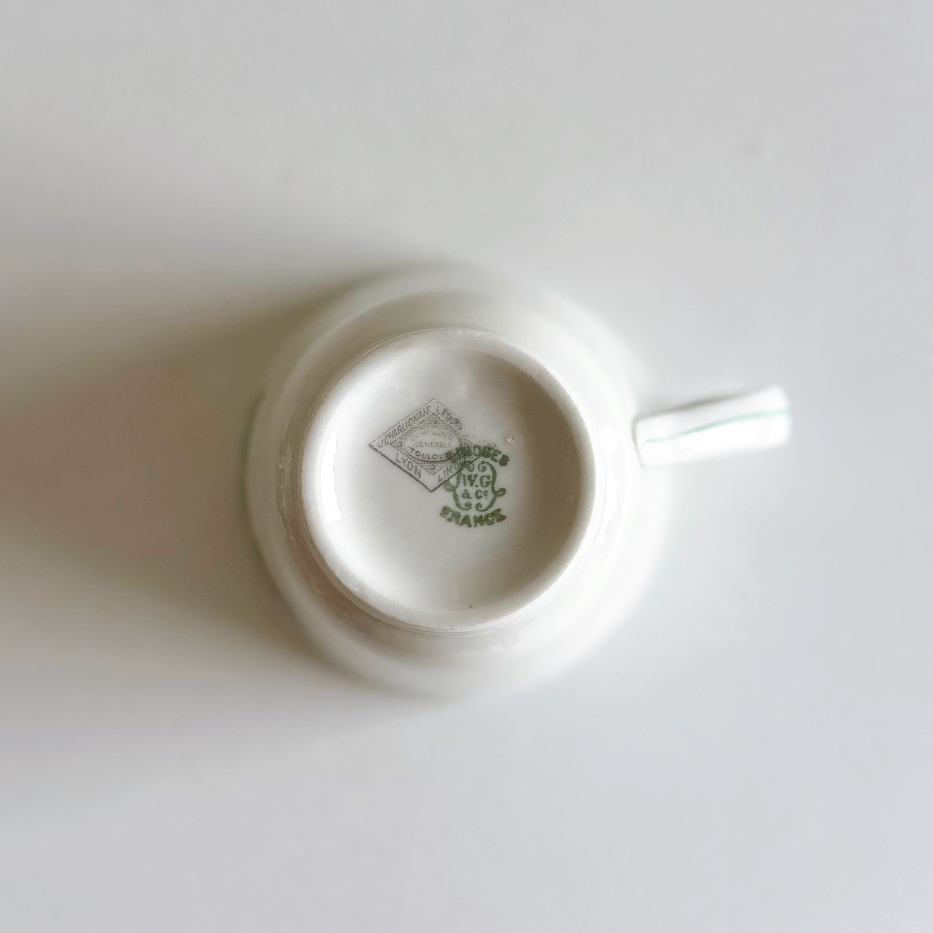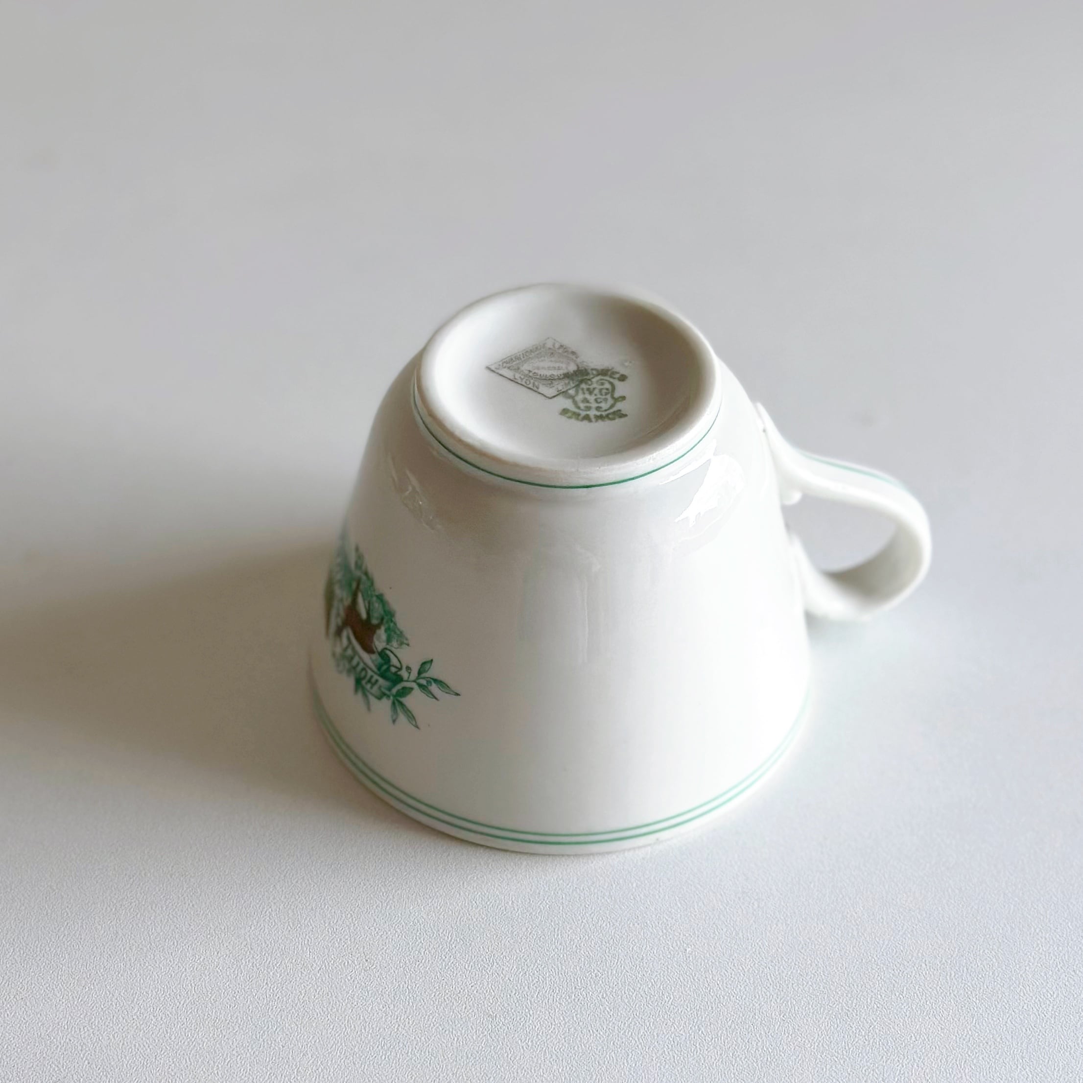 ホテルやカフェ、レストランの食器を受注生産していた、 J. Charlionais et L. Pourailly の刻印と、リモージュ W. Guerin のダブルネームがあるマグカップです。