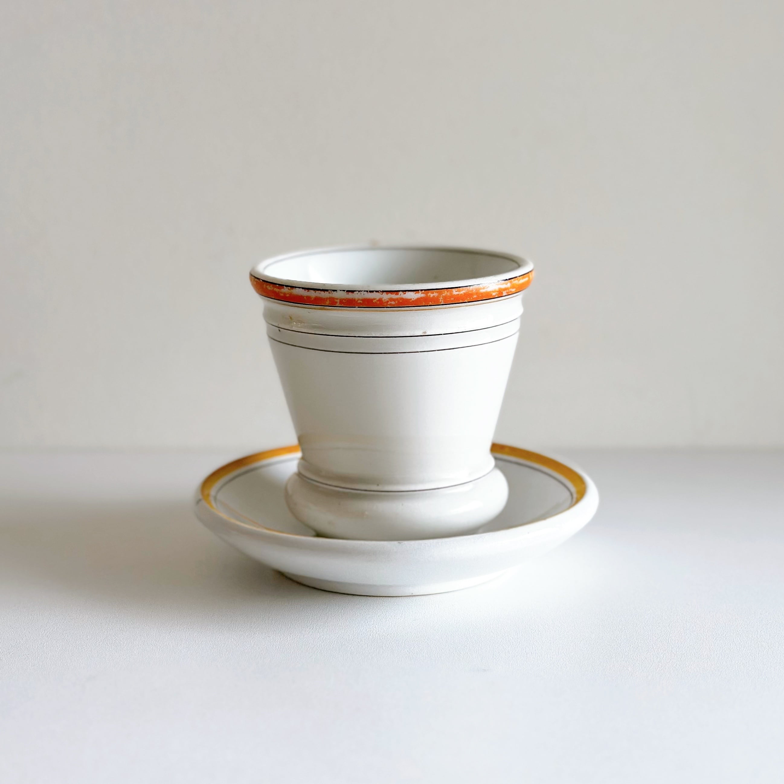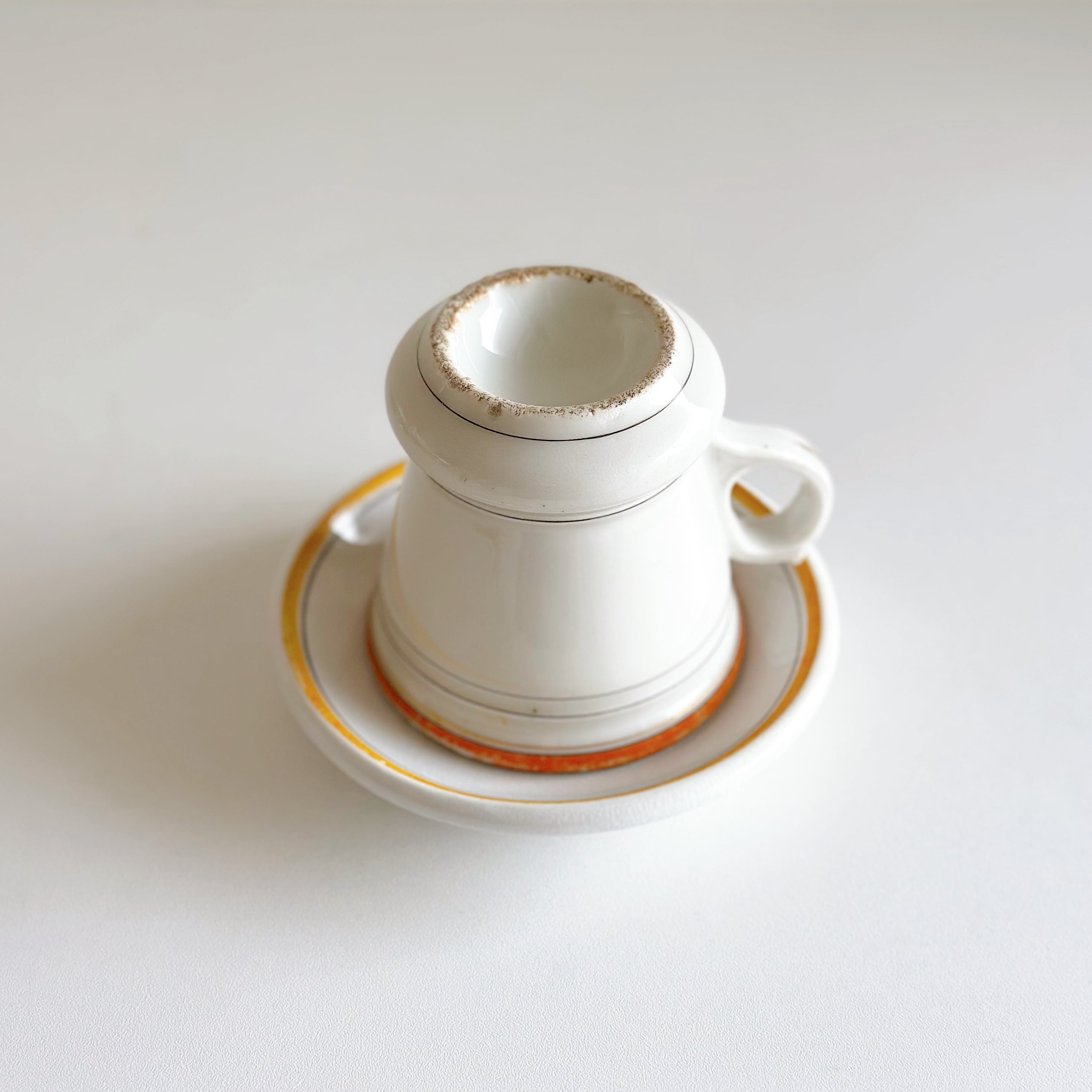 熱いコーヒーを飲み終えたら、カップをひっくり返して、高台にカルヴァドスを入れる。カップの熱でカルヴァドスの甘い香が立ち込めて、その香りを楽しみながら啜る。なんともフランス人が好きそうな嗜みかたですね。そんなひとときのために作られていたブリュロ (Brûlot)カップは、ゆっくりと時間を楽しむおとなのカップです。