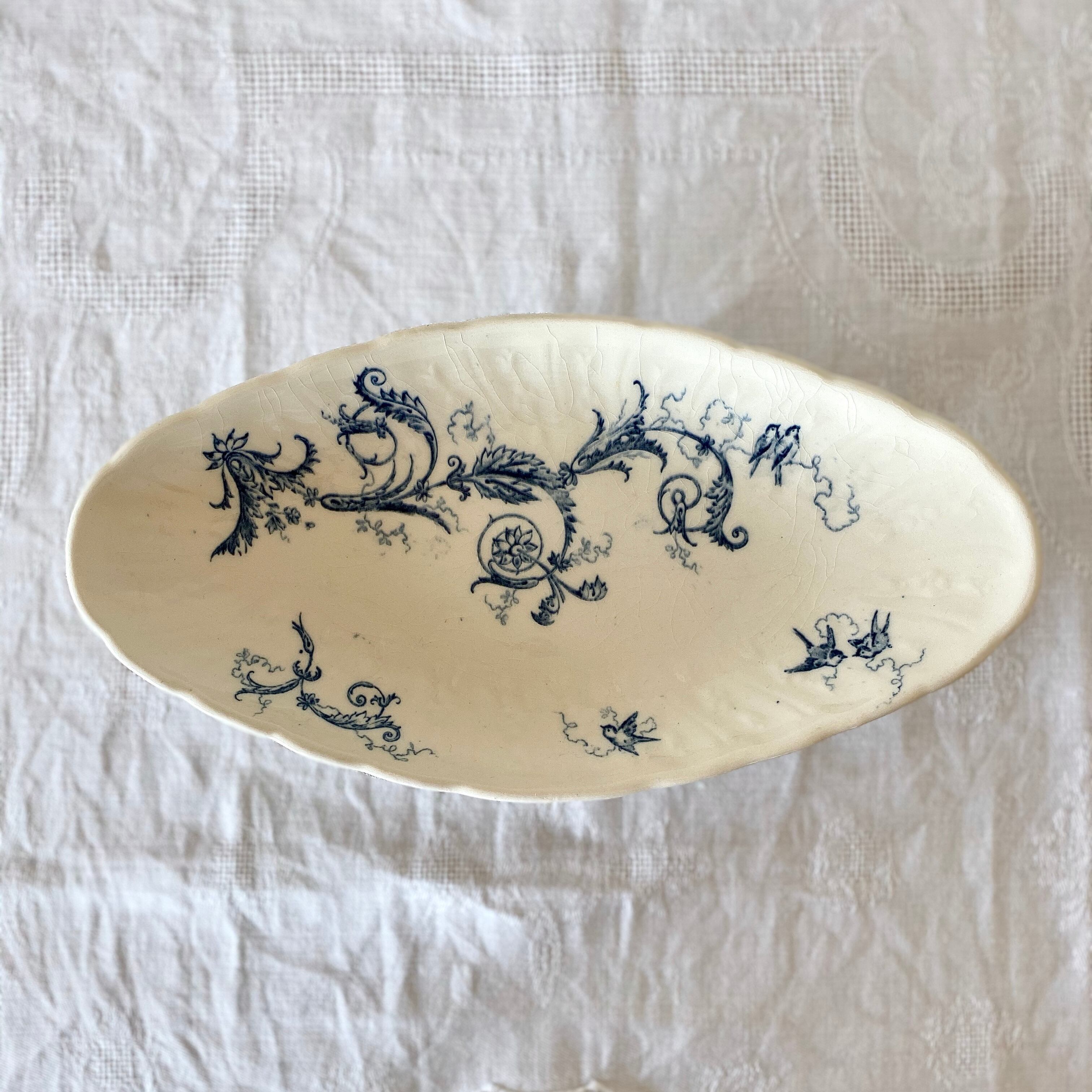 ジアンブルーと呼ばれる美しい紺色のボタニカルのデザインには、小さなつばめが飛んでいます。